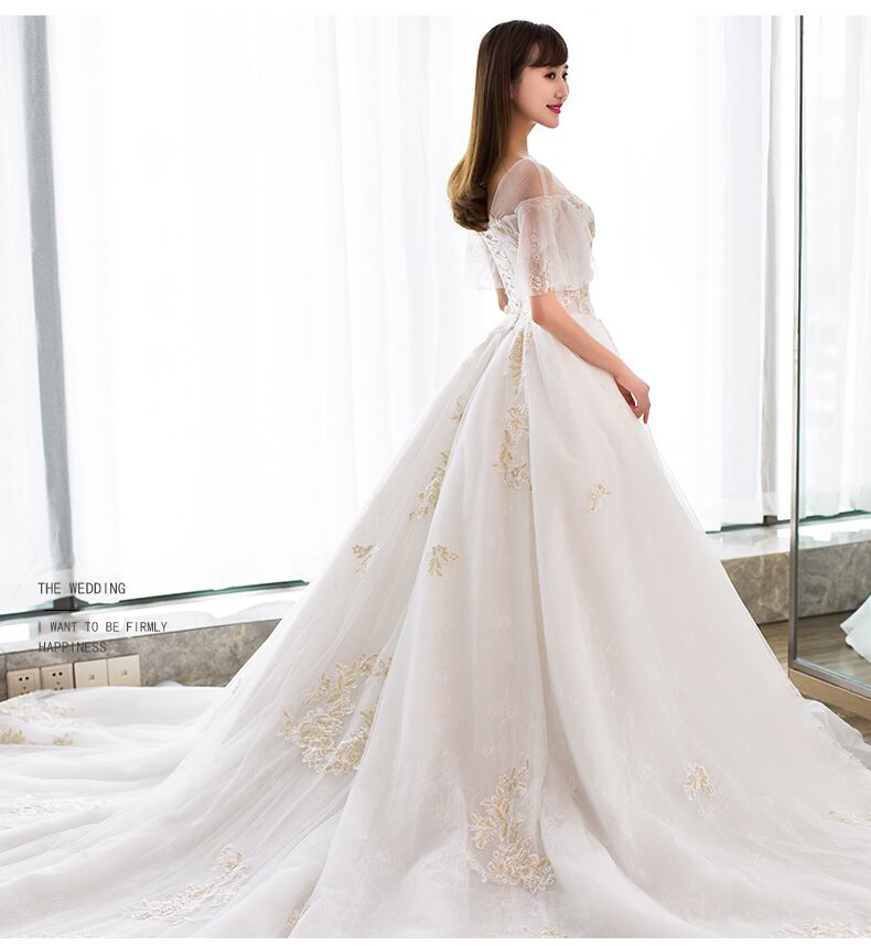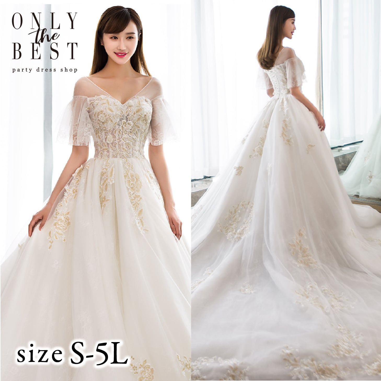 シャンペンゴールドの花モーチフ刺繍を全体に施し、エレガンドな花嫁を演出する。