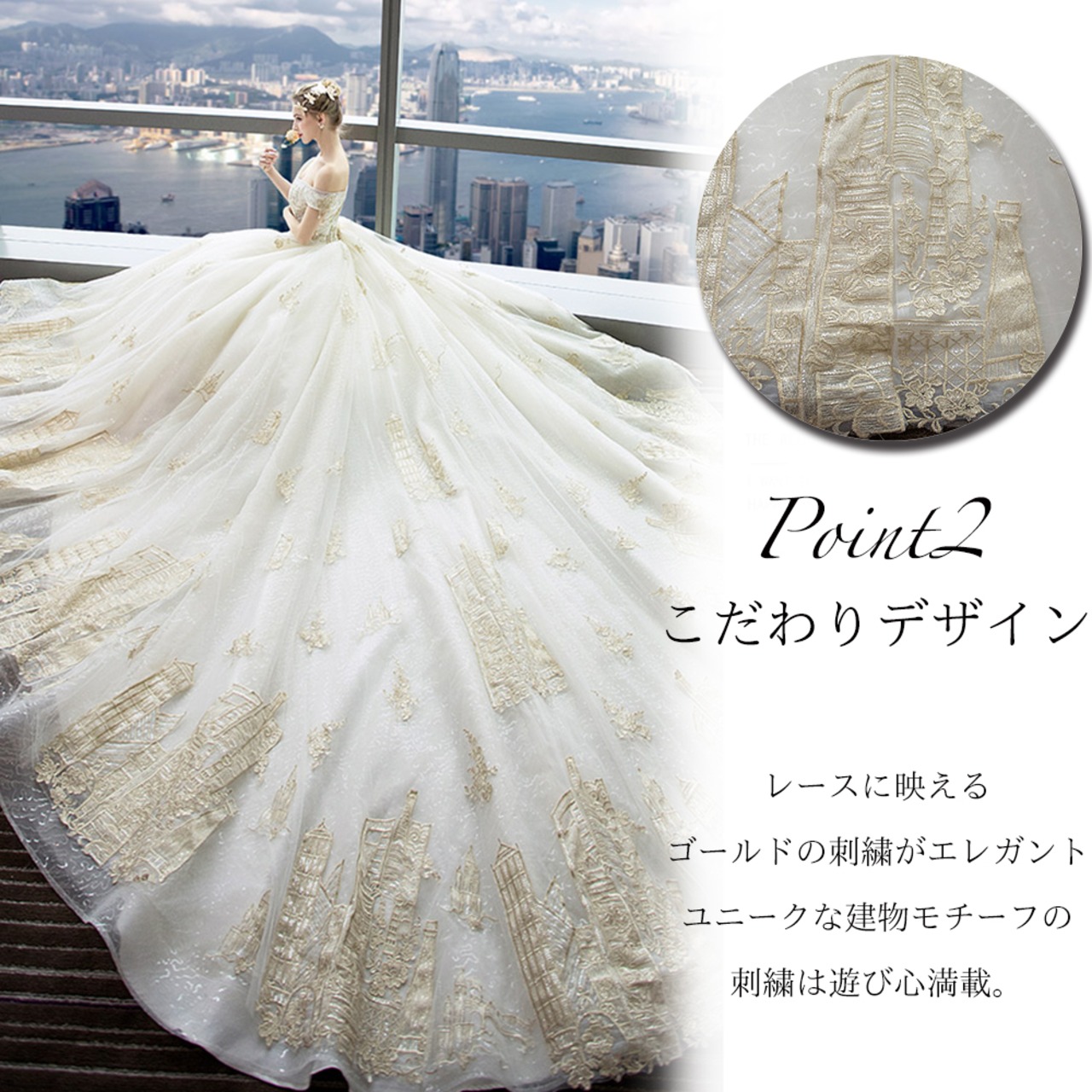 ユニークな建物モーチフの刺繍を施し、遊び心満載のウェディングドレス。