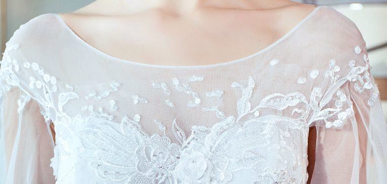 シースルーレースのデコルテがナチュラル感あふれるウェディングドレス。