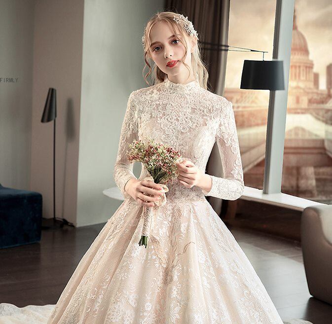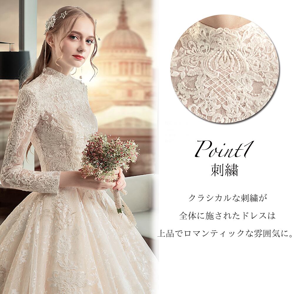 スタンドカラー 長袖 ヴィンテージ風 刺繍 レース ウェディングドレス 白 二次会 花嫁 ウェディングドレス 大きいサイズ ドレス 袖あり ウェディングドレス 二次会 花嫁 ウェディングドレス 激安 ウェディングドレス 大きいサイズ ウェディングドレス カラードレス Aライン