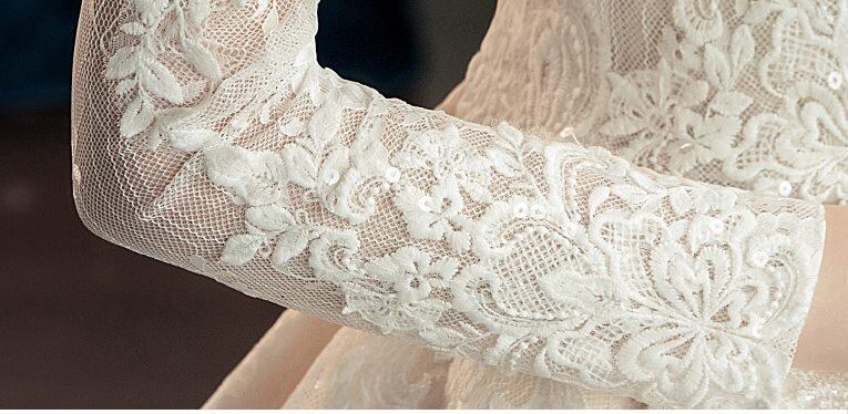 繊細なレースを全体に使い、今人気の長袖のロマンティックなドレス。