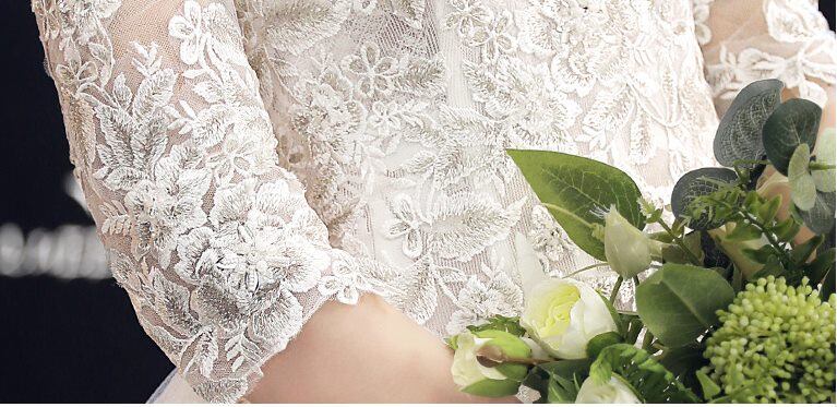 女性の身体のラインを美しく見せる、シースルーのデコルテからスリーブがエレガントな雰囲気を印象付ける大人スタイル。