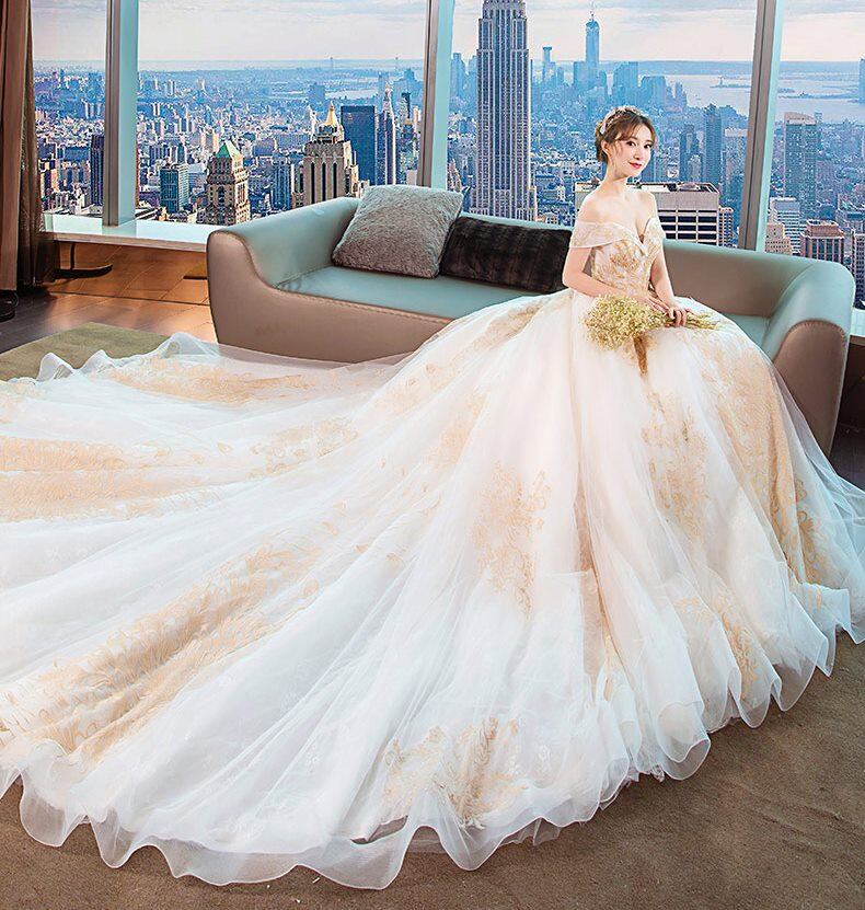 オフショルダ- ゴールド刺繍 刺繍 Aライン チュール レース 刺繍 ロングドレス ウェディングドレス 花嫁ドレス 結婚式 二次会 披露宴 前撮り フォトウェディング スピンドル レースアップ 調節可能 ホワイト系 シンプル 大きいサイズ マタニティ L 2L 3L 4L 5L プリンセス 真珠 ビーズ刺繍 ゴージャス 豪華 ロマンティック きらきら アンティーク 韓国風