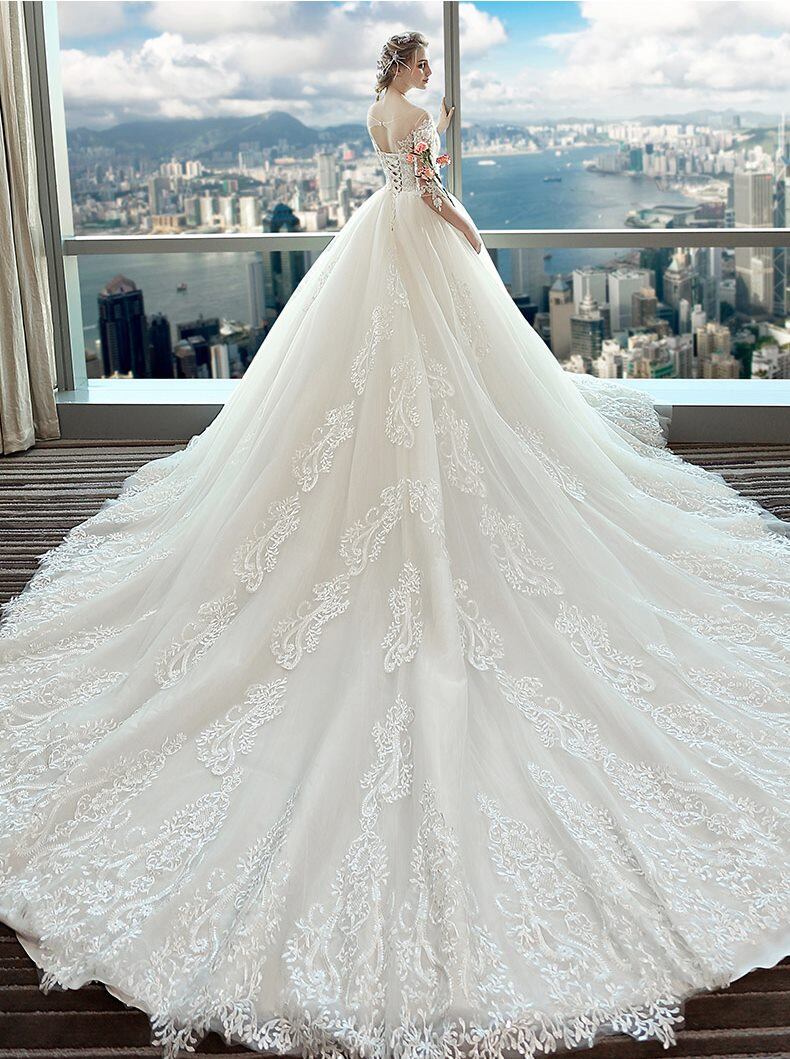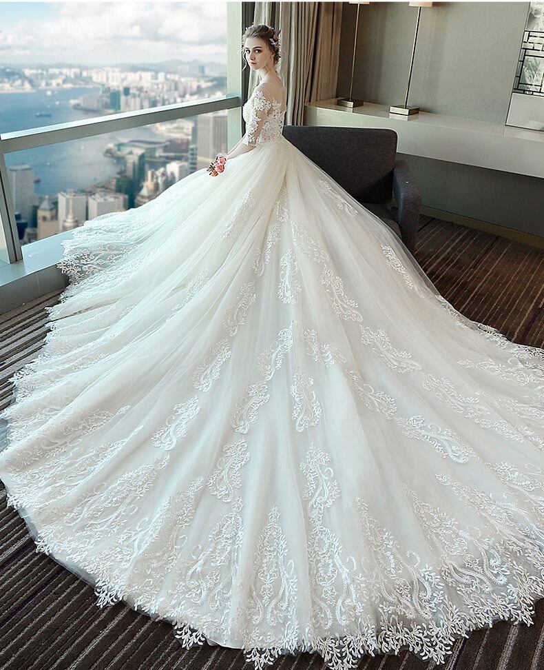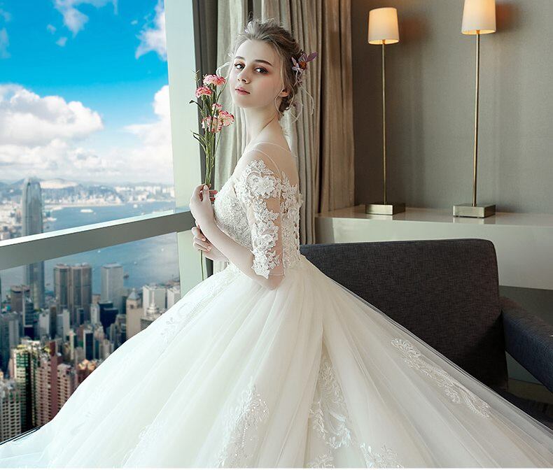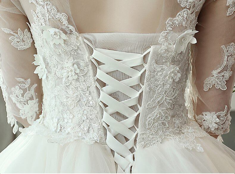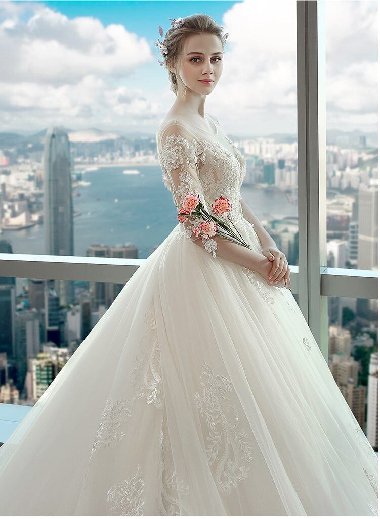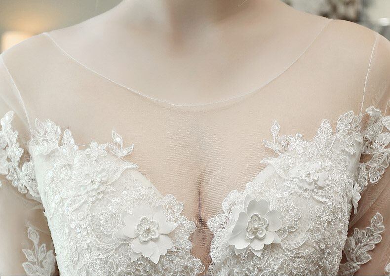 ラウンドカラー 3D花 刺繍 レース チュール Aライン ロング ウェディングドレス 白 二次会 花嫁 ウェディングドレス 大きいサイズ 袖あり ウェディング 花嫁 白 ウェディングドレス オフショルダー ウェディングドレス 二次会 花嫁 ウェディングドレス 大きいサイズ