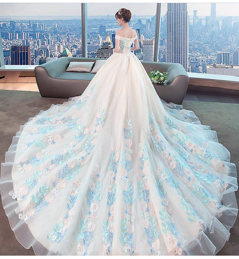 真珠と刺繍を施したトップに水色の刺繍を裾まで咲かせたウェディングドレス。