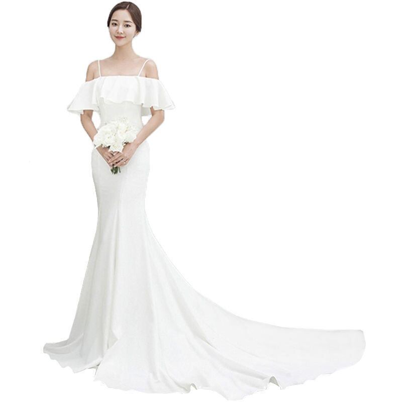 魚の尾 オフショルダー トレーン 白 サテン ウエディングドレス 二次会 花嫁 ワンピース ドレス ロングドレス パーティードレス
