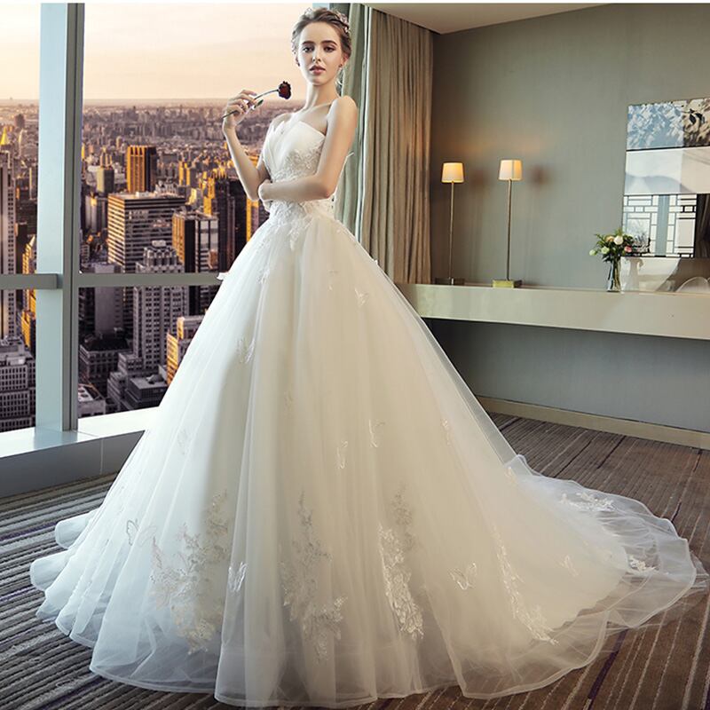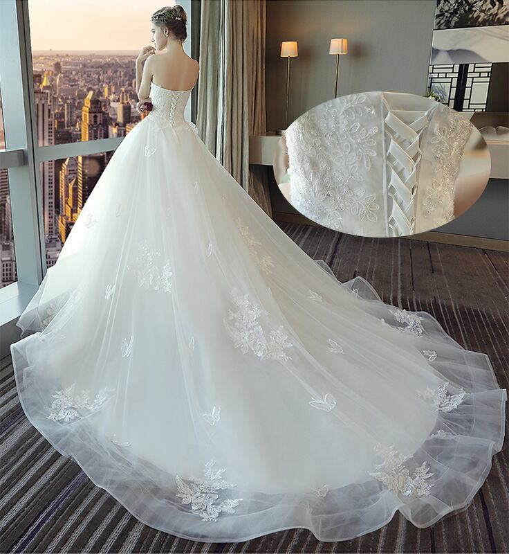 結婚式 女性 花嫁ドレス 白いチューブトップ シンプル ロングテール ミドルウエスト スパンコール