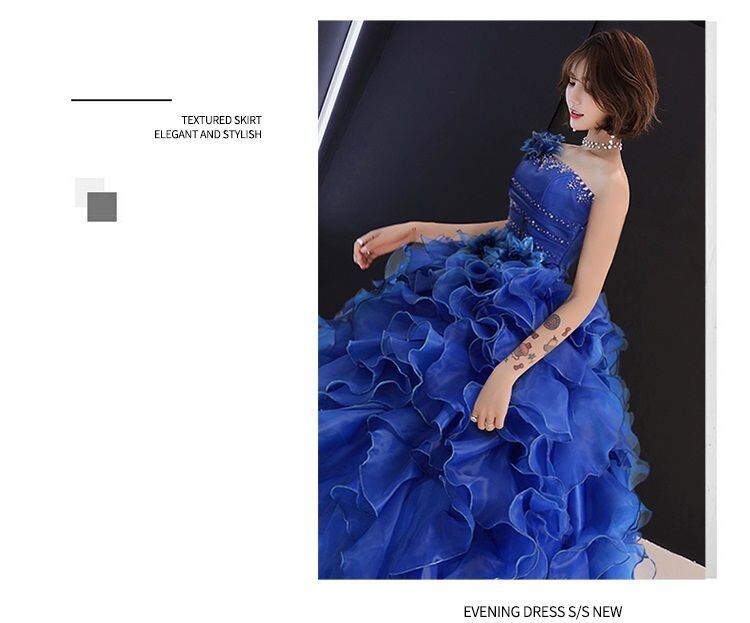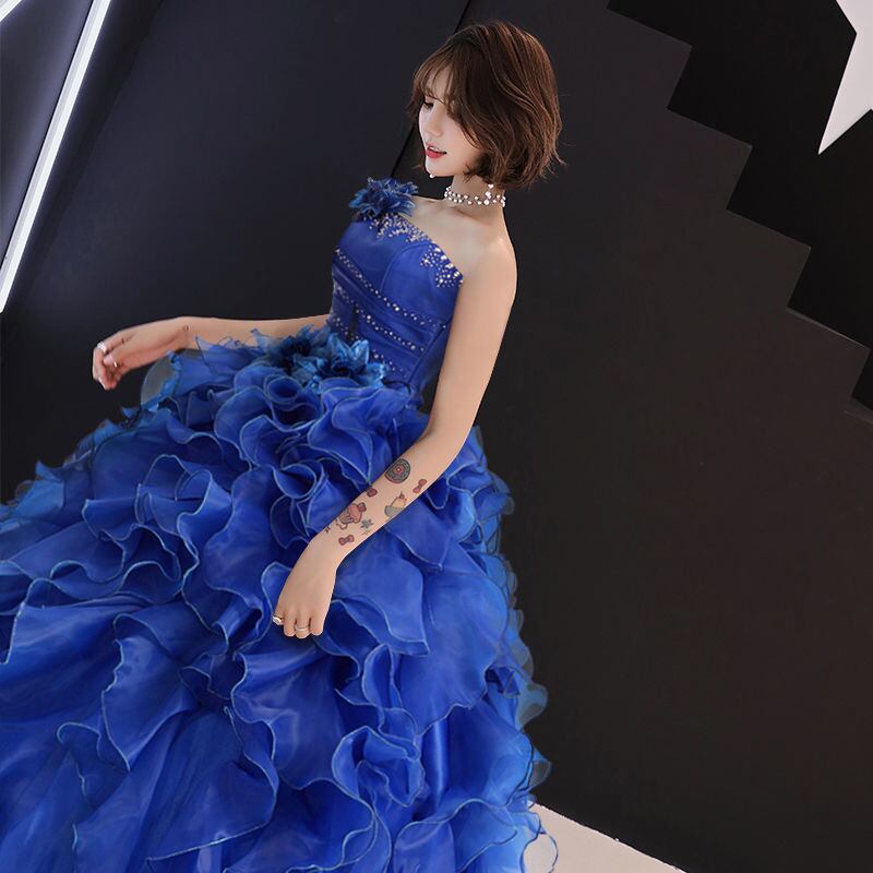 韓国 ノースリーブ ワンショルダー ブルー ウェディングドレス 二次会 花嫁 ウェディングドレス カラードレス ウェディングドレス 大きいサイズ 結婚式 謝恩会 発表会 演奏会