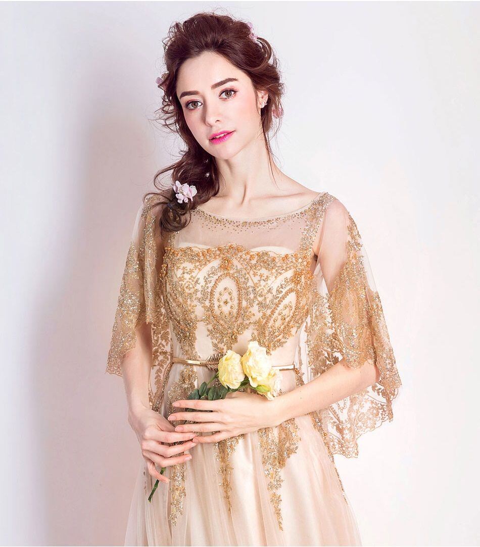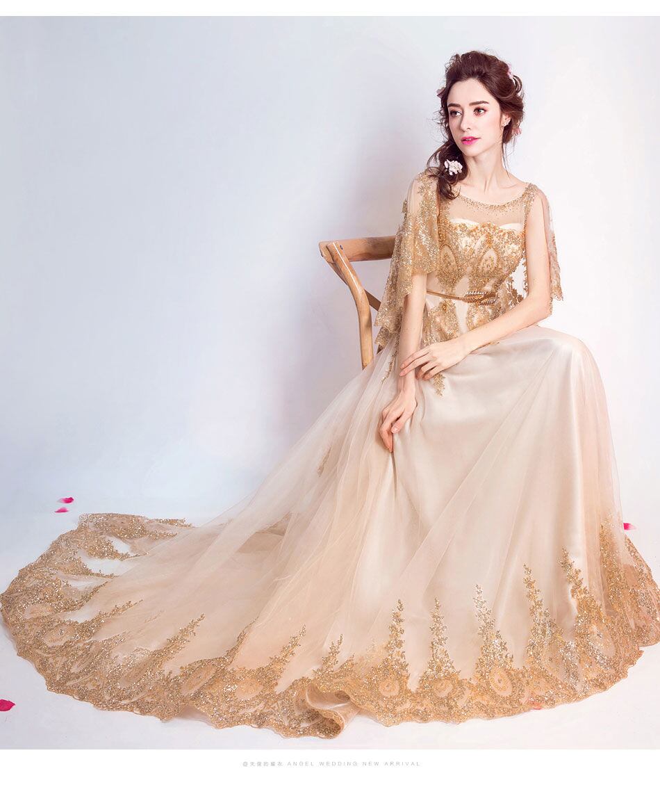 レトロ ゴールド 七分袖 オフショルダートレーン ウェディングドレス 二次会 花嫁 ウェディングドレス カラードレス ウェディングドレス 大きいサイズ 結婚式 謝恩会 発表会 演奏会